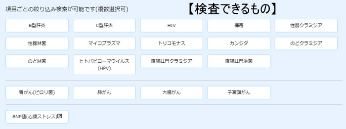 検査項目も非常に豊富で、HIV、梅毒、クラミジア、淋菌、トリコモナス、カンジダなど、男女別に細かく対応。
